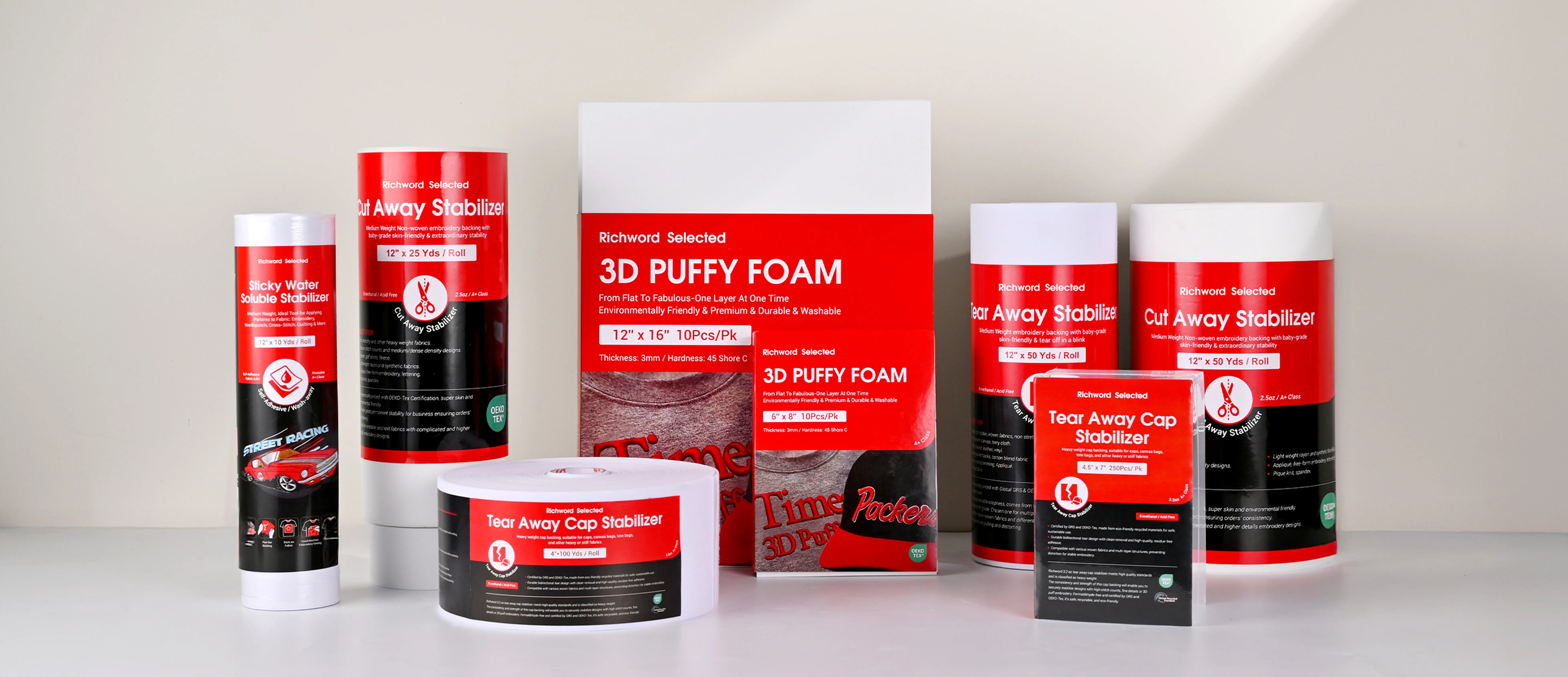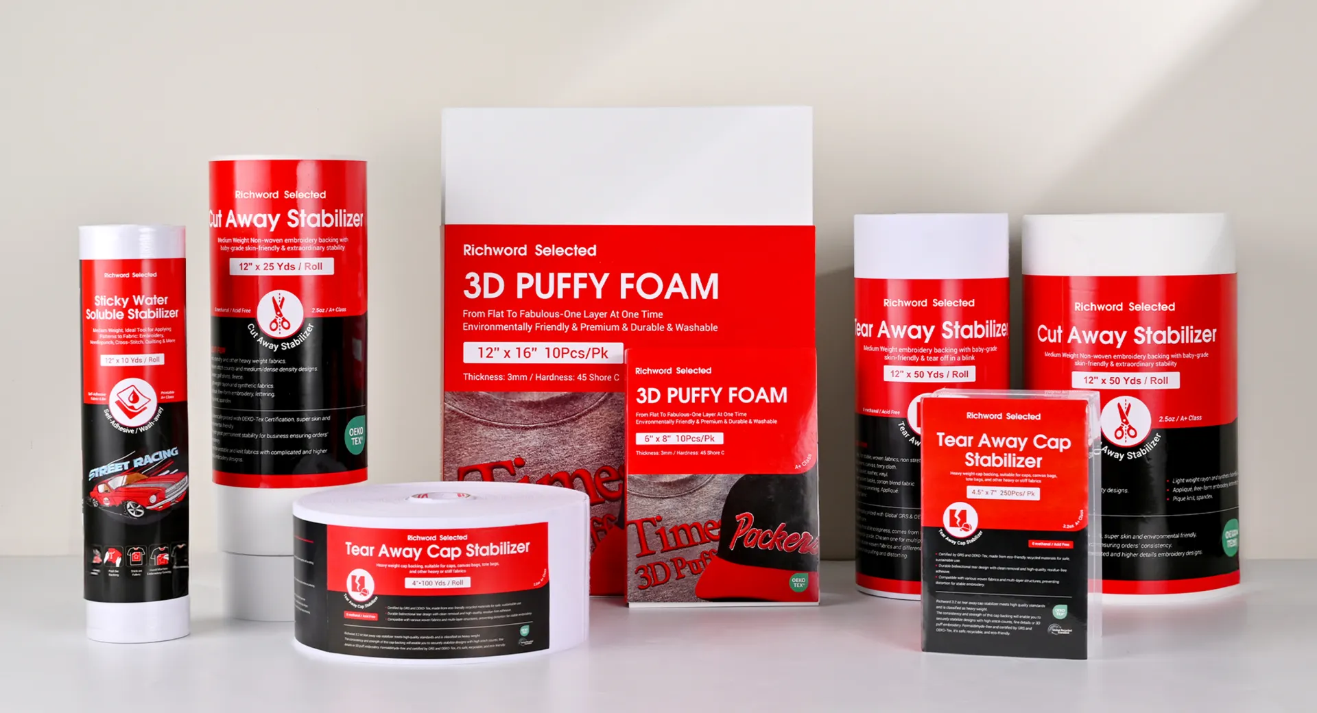 We offer cut away, tear away, and wash away stabilizers—available in rolls or pre-cut sheets.